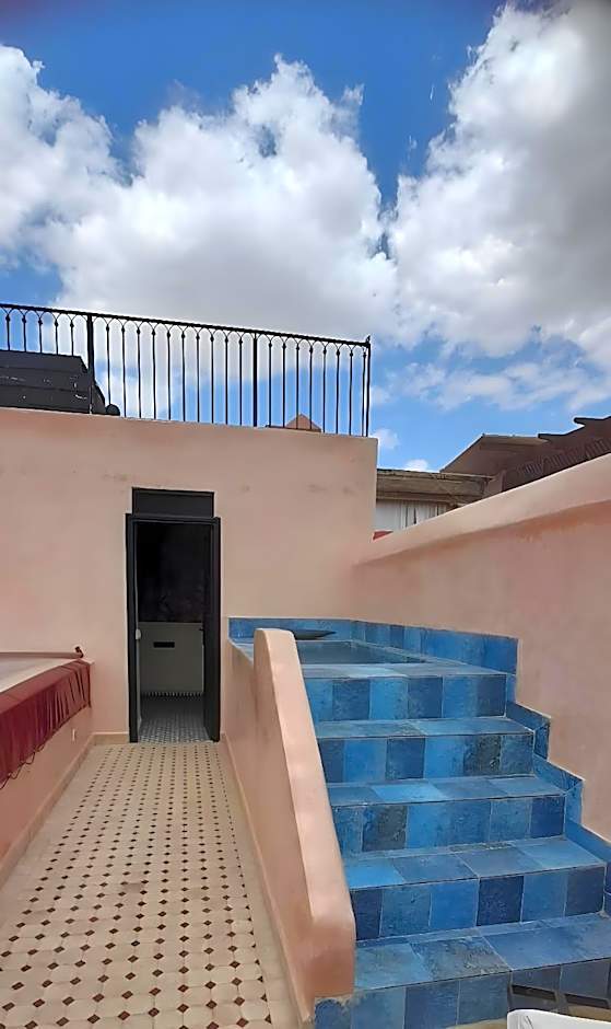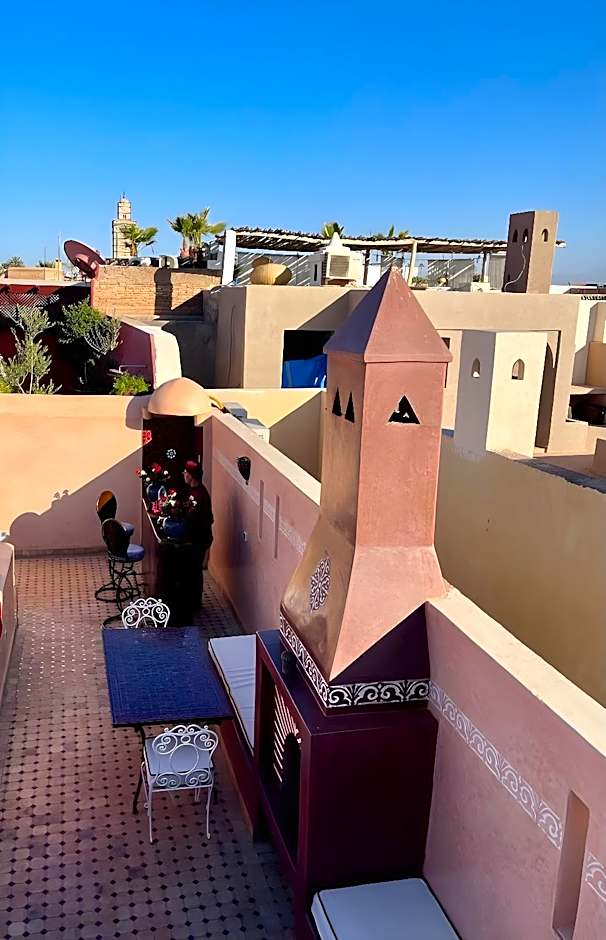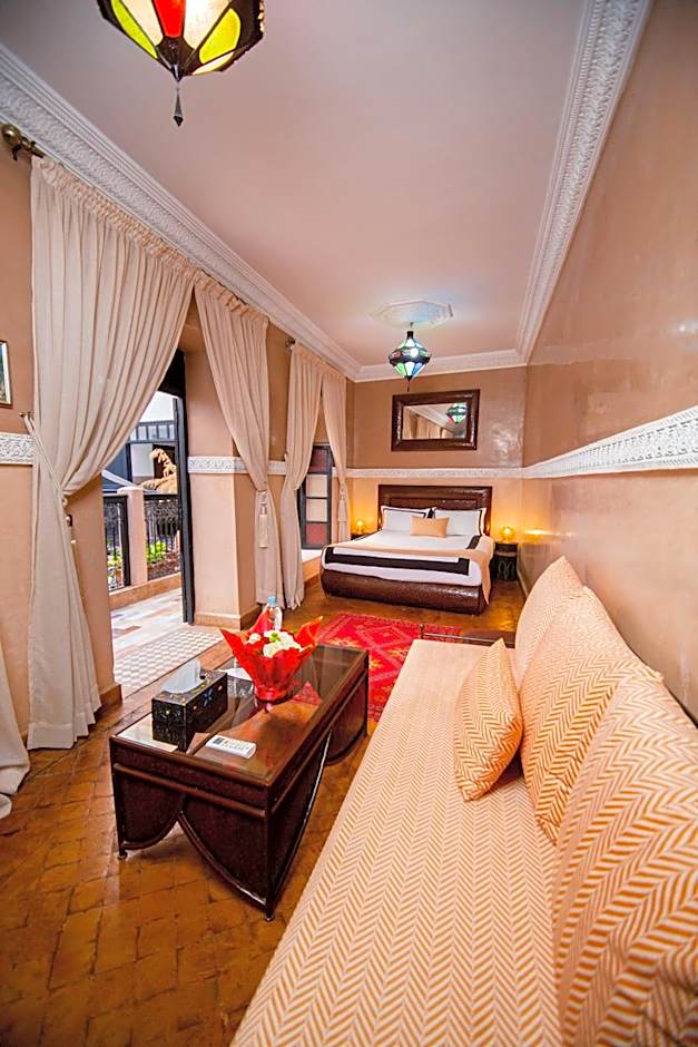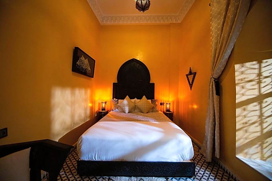 A very large room with polished, wrought-iron furniture, located on the first floor of the riad. The huge bathroom is made of tadelakt black and has a small window that opens out over the derb below.