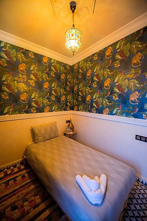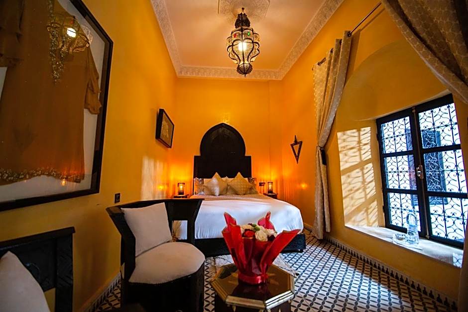 A very large room with polished, wrought-iron furniture, located on the first floor of the riad. The huge bathroom is made of tadelakt black and has a small window that opens out over the derb below. Room is 82 ft² and has a king-size bed.