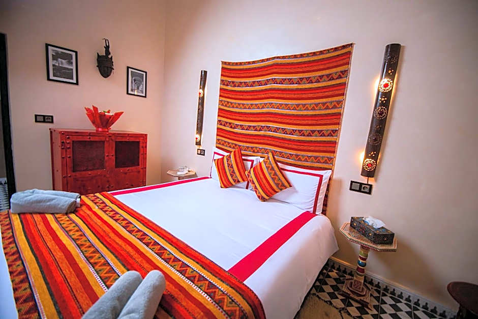 A large room decorated with original zouaké cedar furniture, on the ground floor of the riad. It has a traditional Berber tent-style king-size bed to create an intimate ambiance.