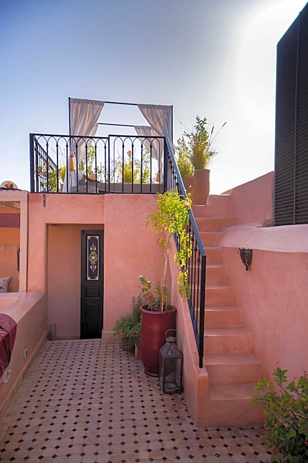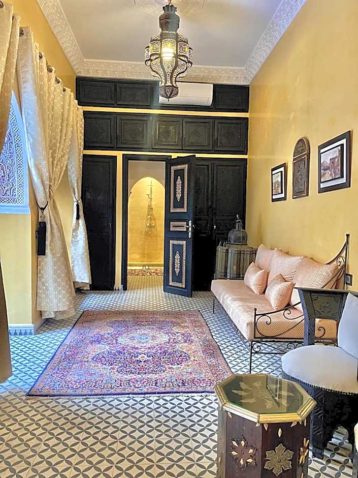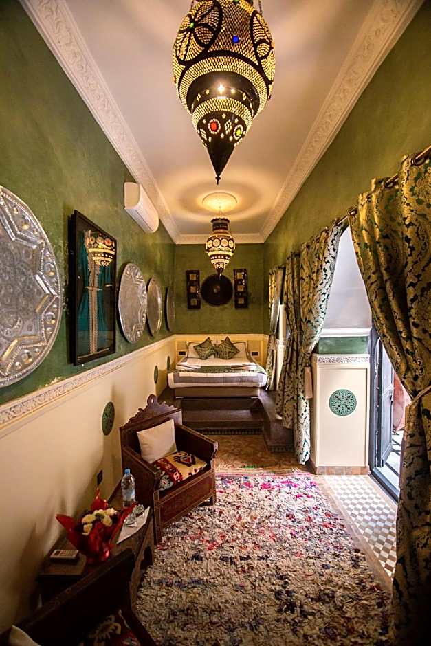 A very large room with polished, wrought-iron furniture, located on the first floor of the riad. The huge bathroom is made of tadelakt black and has a small window that opens out over the derb below. Room is 82 ft² and has a king-size bed.