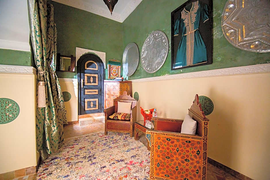 A large room decorated with traditional Berber-style painted cedar furniture, located on the first floor of the riad. It is south-facing, so it is very sunny. The bathroom is made of tadelakt black. Room size is 250 square feet and has a queen-size bed.