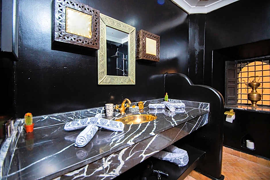 A very large room with polished, wrought-iron furniture, located on the first floor of the riad. The huge bathroom is made of tadelakt black and has a small window that opens out over the derb below.